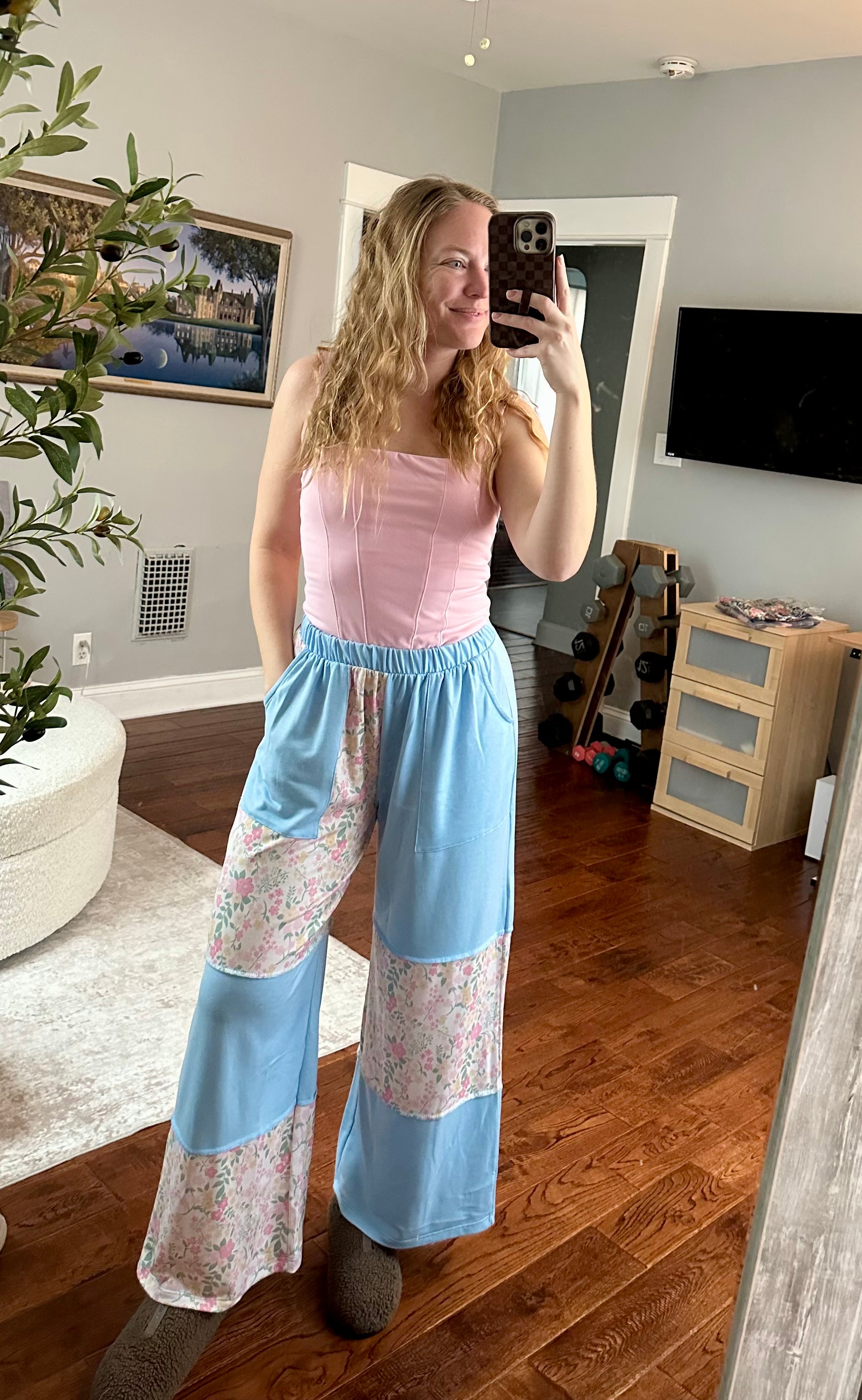 Banded Waist Solid French Terry Floral Print Color Block Wide Leg Pants with Pocket
